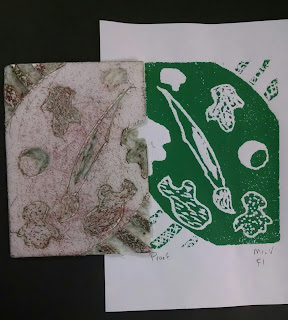 Students learned about the traditional ways to label their prints. In the beginning stages of printmaking, the artist "proofs" their plate. This is the process of creating several test or practice prints to make sure all the lines and shapes are printing how they want. During this stage, changes can be made to the plate between proofs. This is also a time to try out different colors. Because of this "testing" time, those prints are labeled as a proof in the bottom left. Then the artist traditionally signs their work on the bottom right. You can also see how the image on the plate is different from the printed image, it prints as a mirror image opposite of each other.